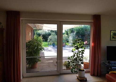 Alle Fenster sind mit abnehmbaren Fliegengittern versehen, die Velux-Dachflächenfenster werden mit solarbetriebenen Rollläden beschattet.
