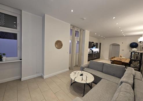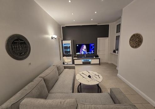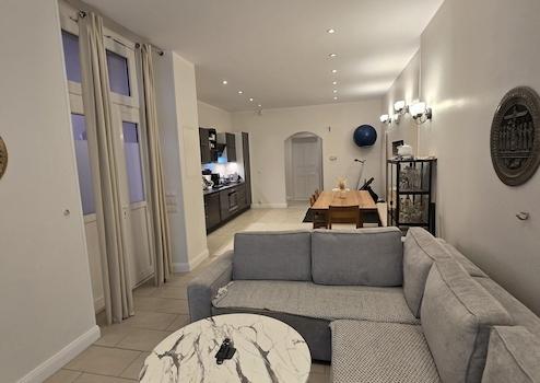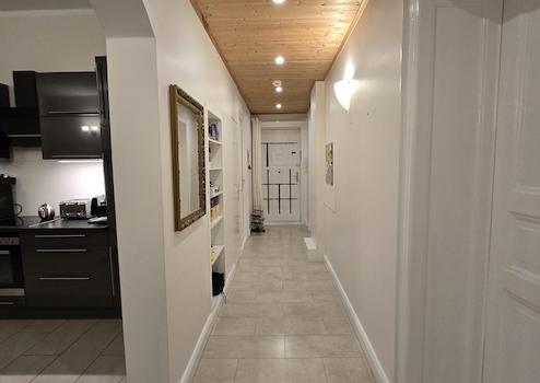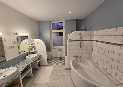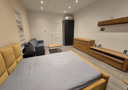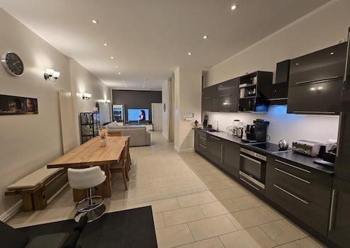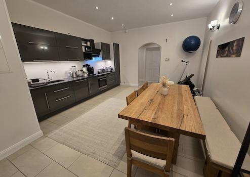 This impressive 120 m² ground-floor apartment (Hausotterstraße, 13409 Berlin) stands out with its expansive layout and high-quality furnishings. The heart of the home is the 40 m² living room, featuring an integrated gym corner and a large TV. A separate 22 m² office provides the perfect environment for working from home, supported by pre-installed high-speed Wi-Fi (included).