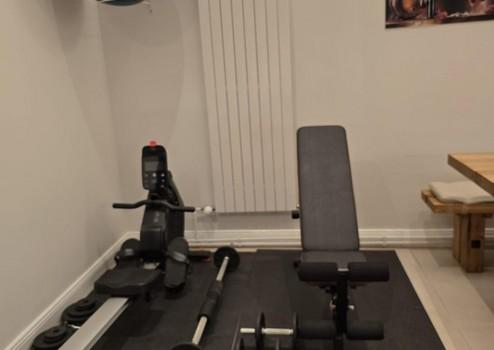 •Wohnzimmer (ca. 40 m²): Helle Lounge-Area, mit TV und privatem Fitness-Bereich inklusive