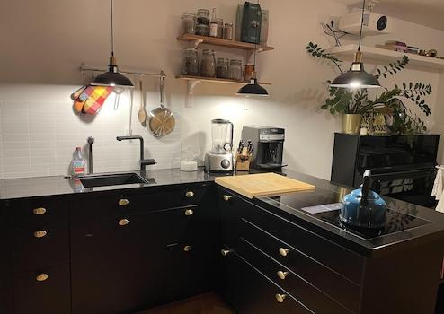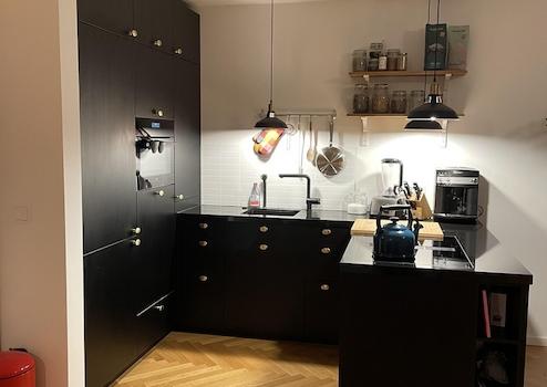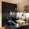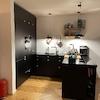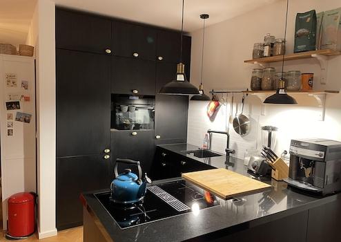 Die Wohnung ist mit einer schwarzen Einbauküche mit Steinarbeitsplatte und hochwertigen Elektrogeräten von AEG und Miele ausgestattet. Gekocht wird mit Induktion.