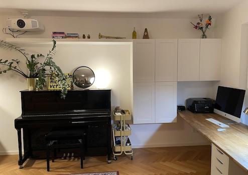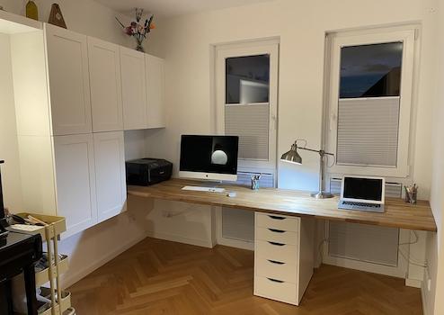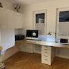 Der für die Wohnung maßgefertigte Schreibtisch aus Echtholz sowie die dazugehörige Schrankkonstruktion sind im Mietpreis enthalten. Selbstverständlich kann die Möblierung vom Mieter verändert werden.