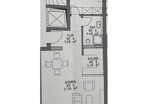Die Wohnung besteht aus zwei Zimmern, einem Bad und einem Südbalkon. Mittelpunkt der Wohnung ist die über 30 Quadratmeter große Wohnküche. Das Schlafzimmer ist zur Gebäuderückseite orientiert. Dazwischen liegen der Eingangsbereich und das Bad.