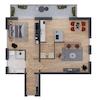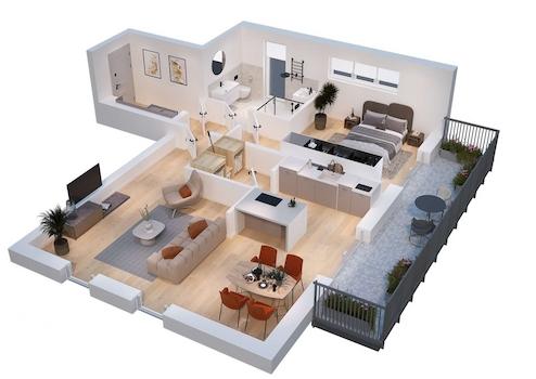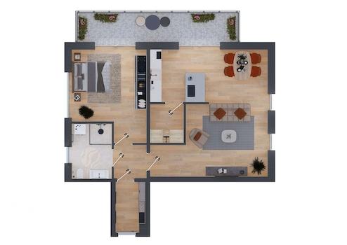 Die Wohnung verfügt über eine großzügige Zwei-Zimmer-Aufteilung mit einem weitläufigen Wohnbereich sowie einem separaten Schlafzimmer. Ein modernes Badezimmer ergänzt das Raumangebot. Die Wohnfläche beträgt 75,25 m² und wird durch einen großzügigen Balkon mit 12,56 m² ergänzt, der zusätzlichen Freiraum und einen angenehmen Außenbereich im Obergeschoss bietet.