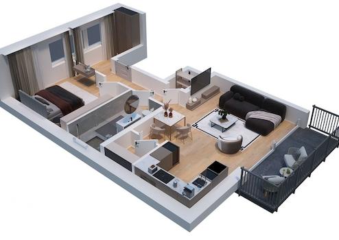 Die Wohnung verfügt über eine gut geschnittene Zwei-Zimmer-Aufteilung mit einem großzügigen Wohn- und Essbereich sowie einem separaten Schlafzimmer. Ein modernes Badezimmer ergänzt das Raumangebot. Die Wohnfläche beträgt 62,43 m² und wird durch einen Balkon mit 6,24 m² ergänzt, der zusätzlichen Freiraum im Obergeschoss bietet.