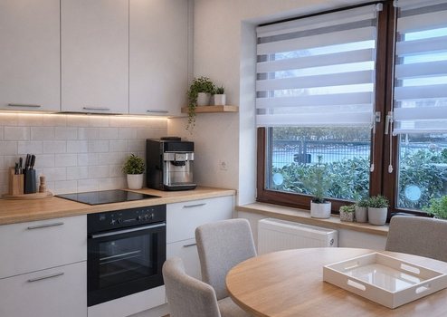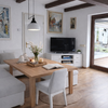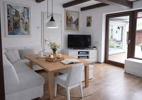 Einige Fotos sind Einrichtungsbeispiele, mit Ki bearbeitet. Das sind die Fotos vom Wohnzimmer, der Essecke, der Küche und ein Schlafzimmer.
