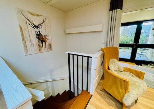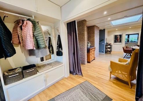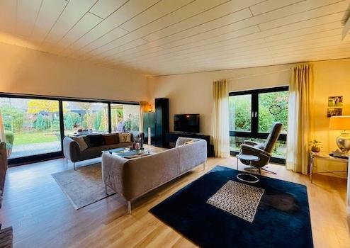 Die Aufteilung und Ausstattung ergibt sich wie folgt: großzügiger Eingangsbereich und Diele (Windfang mit Garderobe), ein hübsches Gäste-WC, ein gemütlicher Essbereich, zwei Kinderzimmer bzw. Büros, ein großes Elternschlafzimmer, ein geschmackvolles und geräumiges Badezimmer mit ebenerdiger Glasdusche, Waschtisch und WC, eine helle Wohnküche (die weiße Nobilia-Küche verbleibt im Haus und ist im Kaufpreis enthalten) sowie ein traumhafter und sonniger Wohnbereich mit Innenkamin, sowie großen, bodentiefen Fensterflächen (Glasschiebe-Elemente) mit Ausgang auf die Terrasse mit Außenkamin und in den wunderschön angelegten Garten mit Wasserspiel.
