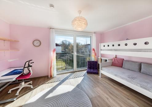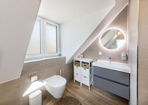 Im Obergeschoss befinden sich zwei Eckzimmer mit ca. 12 m² und ca. 15 m². Das Badezimmer ist mit großformatigen Fliesen in der Farbe greige und einer großzügigen bodengleichen Dusche ausgestattet.