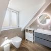 Das Dachgeschoss kann als Elternbereich mit Schlafraum und Ankleide genutzt werden. Ein weiteres Wannen-Badezimmer mit großformatigen Fliesen in Parkettoptik steht hier zur Verfügung.