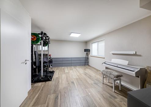 Der Hobbyraum im KG ist ebenfalls mit einer Fußbodenheizung ausgestattet. Der Haustechnikraum dient gleichzeitig als Waschküche. Die Weichwasseranlage enthärtet das Wasser für das gesamte Haus. Eine separate Speisekammer ist zudem im KG vorhanden.