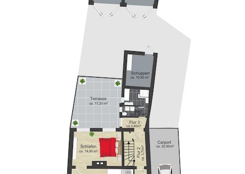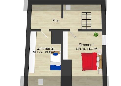 Das Dachgeschoss ergänzt das Raumangebot um zwei weitere Räume, die sich besonders gut als praktische Nutz- und Abstellflächen eignen. Hier findet alles seinen Platz, was im Alltag nicht ständig benötigt wird – von Vorräten bis hin zu Hobby- oder Dekorationsartikeln. Ein zentraler Flur verbindet die Räume und sorgt für eine übersichtliche Gliederung dieser Ebene.