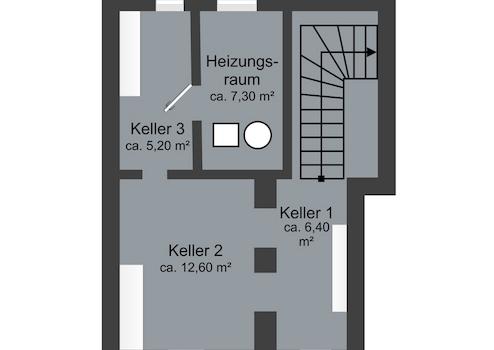 Im Kellergeschoss stehen drei separate Kellerräume sowie ein Heizungsraum zur Verfügung, die ausreichend Platz für Abstellflächen, Vorräte und haustechnische Einrichtungen bieten.