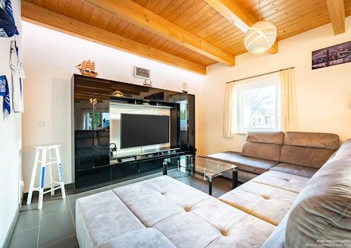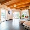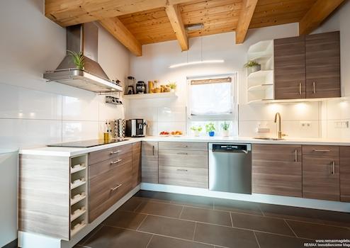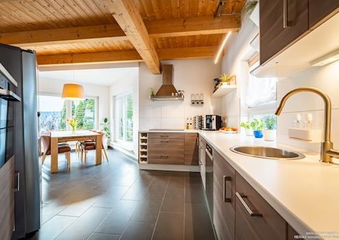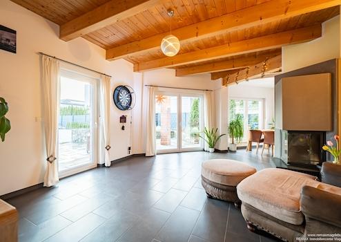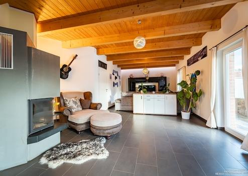 Im Erdgeschoss empfängt Sie ein heller, freundlicher Flur, von dem aus alle Räume bequem erreichbar sind. Der offen gestaltete Koch- und Essbereich geht fließend in den Wohnbereich mit Kamin über und bildet das Herzstück des Hauses. Große Fensterfronten durchfluten den Raum mit Tageslicht und schaffen ein freundliches Ambiente. Die gemütliche Holzdecke mit sichtbaren Holzbalken verleiht dem Wohnbereich einen besonders warmen, einladenden Charakter und sorgt für ein behagliches Wohnflair. An kühleren Tagen lädt der Kamin zu entspannten Stunden in wohnlicher Atmosphäre ein.