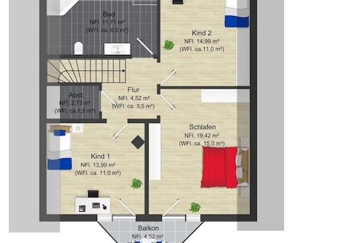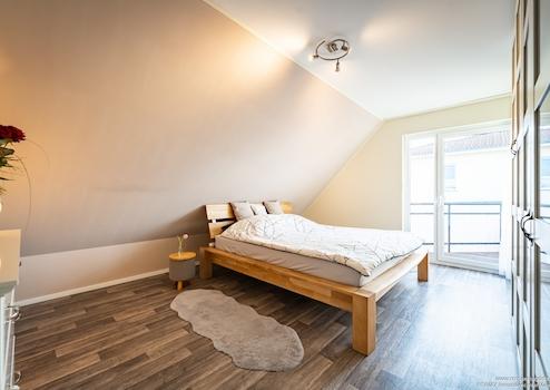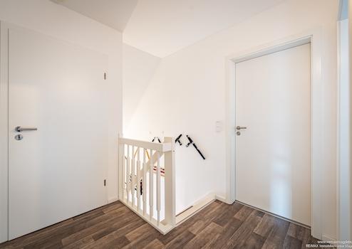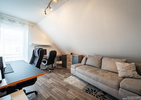 Im Dachgeschoss stehen Ihnen drei vielseitig nutzbare Schlafzimmer zur Verfügung, die sich ideal als Schlaf-, Kinder-, Gäste- oder Arbeitszimmer eignen. Das großzügige, modern ausgestattete Badezimmer verfügt über eine Eckbadewanne sowie eine ebenerdige Dusche. Der Flur bietet einen praktischen Abstellraum und ermöglicht über eine Bodeneinschubtreppe den Zugang zum Spitzboden. Dieser dient als zusätzlicher Stauraum für Koffer, Dekoration oder saisonale Gegenstände. Zwei der Schlafzimmer verfügen über einen direkten Zugang zum Balkon mit schönem Blick ins Grüne.