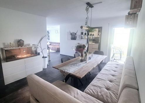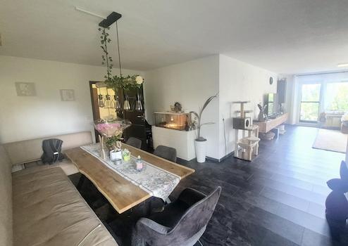 Der offene Wohn- und Essbereich bildet das Herzstück der Wohnung. Große Fenster sorgen für viel Tageslicht und schaffen eine angenehme Wohnatmosphäre. Von hier aus gelangen Sie direkt auf beide Terrassen, die viel Platz für eine gemütliche Sitzecke oder eine kleine Outdoor-Lounge bieten – perfekt, um die ruhige Umgebung und die frische Luft zu genießen.