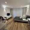 LED-Deckenspots, glatte weiße Wände und ein hochwertiger Bodenbelag verleihen der Wohnung eine helle und elegante Atmosphäre.