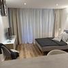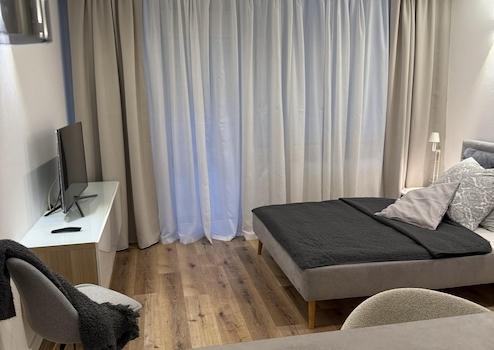 Ein bequemes 1,40 m breites Bett, ein praktischer Schreibtisch sowie eine moderne TV-Wand mit Samsung Smart TV stehen zur Verfügung.