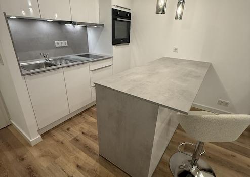 Die offene Küche mit Einbaugeräten (Herd, Backofen, Kühlschrank mit Gefrierfach, Dunstabzugshaube) ist voll ausgestattet – inklusive Töpfe, Pfannen, Besteck – und bietet viel Stauraum für ein angenehmes Wohngefühl.