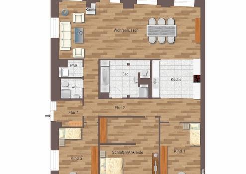 Herzstück der Wohnung ist der weitläufige Wohn- und Essbereich im Loftstil. Große Raumdimensionen, Echtholzparkett und ein stilvoll integrierter Kamin schaffen eine warme, zugleich urbane Wohnatmosphäre. Die Fußbodenheizung sorgt dabei für gleichmäßigen und behaglichen Komfort in allen Räumen.