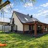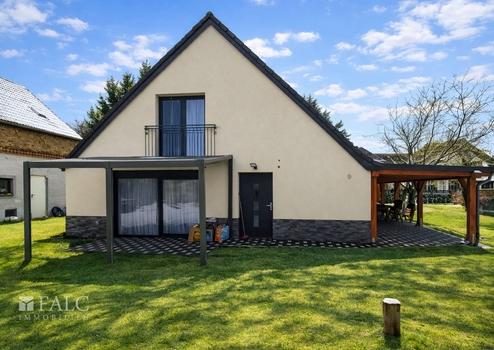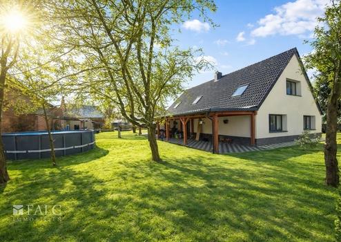 Modern und gepflegt präsentiert sich dieses Haus mit einer klaren, zeitgemäßen Ausstattungsanmutung und viel Komfort im Alltag. In den Wohn und Schlafbereichen sorgt ein Eichenholzparkett für eine warme Atmosphäre, während die Küche mit großformatigen, grauen Bodenfliesen praktisch und pflegeleicht ausgeführt ist. Die Küche ist mit einer weißen Einbauzeile samt Arbeitsplatte, Spüle und Elektrogeräten ausgestattet und bietet zusätzlich Platz für einen Esstisch. Das Bad wirkt modern und freundlich mit großformatigen Wandfliesen, dunklen Bodenfliesen, Badewanne, separater Dusche, wandhängendem WC, Waschtisch und einem Dachflächenfenster für Tageslicht. Großzügige Fensterflächen und eine breite Terrassentür schaffen helle Räume und verbinden den Wohnbereich angenehm mit dem Garten. Im Dachgeschoss unterstreichen sichtbare Holzbalken den Charakter, ergänzt durch Dachflächenfenster und eine offene Raumwirkung. Außen stehen eine weitläufige, überdachte Terrasse mit Holzstützen sowie weitere überdachte Bereiche zur Verfügung, die sich als wettergeschützter Sitzplatz oder Abstellfläche eignen. Der Garten ist großzügig angelegt und bietet viel Platz für Spiel und Freizeit, ergänzt durch einen aufgestellten Pool.