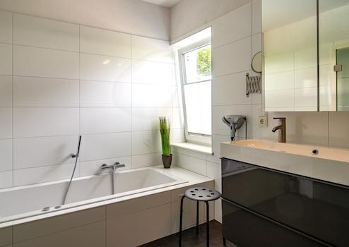– Ein Bad mit bodenebener Dusche sowie Badewanne mit Whirlpool liegt gut erreichbar zwischen zwei Schlafzimmern.