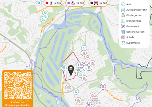 Die Versorgungswege sind ausgesprochen komfortabel: Das Zentrum von Überruhr Hinsel ist in wenigen Minuten erreichbar, und die Anbindung an die Essener Innenstadt ist sowohl mit dem Auto als auch mit öffentlichen Verkehrsmitteln optimal.