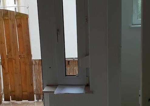Die Wohnung verfügt über eine unmöbelierte Wohnküche mit kleinem Balkon.