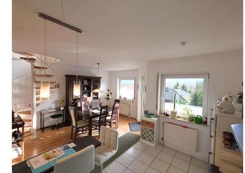 Diese helle Maisonette-Wohnung liegt im 1. und 2. Obergeschoss eines gepflegten Reihenhauses in Schweigen-Rechtenbach, nur etwa 200 m von der französischen Grenze entfernt.