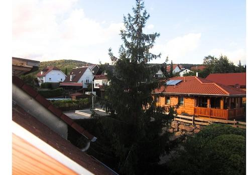 Vom Balkon und aus den Wohnräumen schaut man über Dächer, Weinberge und Felder Richtung Wissembourg im Elsass. Besonders das große Wohnzimmer im oberen Geschoss vermittelt ein Gefühl von Ruhe und Weite – ein Ort, an dem man gerne den Tag ausklingen lässt.