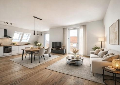 Diese charmante Drei-Zimmer-Dachgeschosswohnung auf 90 Quadratmetern bietet modernes Wohnen mit einem besonderen Flair. Der großzügige, helle Wohn- und Essbereich ist offen gestaltet und sorgt für eine einladende Atmosphäre. Von hier aus gelangen Sie auf die Loggia, die einen wundervollen Außenbereich bietet – perfekt für entspannte Stunden an der frischen Luft.