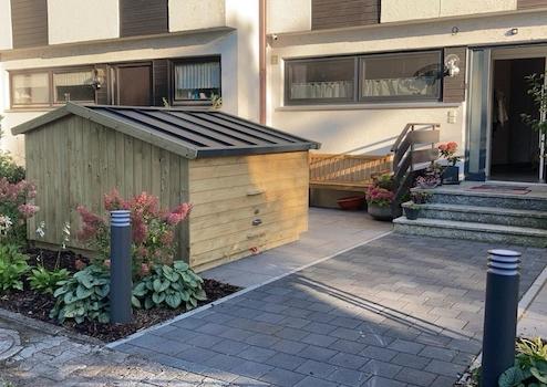 Praktischer Komfort: Eine abgeschlossene Fahrradgarage am Haus sorgt für die sichere und witterungsgeschützte Unterbringung Ihrer Fahrräder und sportlichen Geräte.