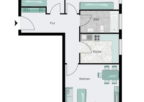 Die Wohnung verfügt über Laminat im Wohnzimmer, Schlaf- und Kinderzimmer. Die Küche, Flur und das Badezimmer sind mit Fliesen ausgestattet. Den Neuanstrich führt der Mieter auf eigene Kosten aus. Die Einbauküche kann optional vom Vormieter übernommen werden. Die Nebenkostenvorauszahlungen beinhalten nicht die Kosten des eigenen Strom, Wasser- und Abwasservebrauchs. Der Energieausweis befindet sich in Bearbeitung.