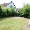 Das Zweifamilienhaus ist umgeben von Bepflanzung und Rasenfläche und einer Terrasse.
