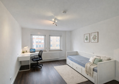 Dein Zimmer ist lichtdurchflutet dank zwei großen Fenster und verfügt über einen schönen Parkettboden.