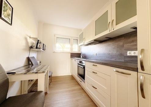 Die Küche ist ein separater Raum und bietet neben der Küchenzeile auch Platz für einen kleinen Essbereich. Die vorhandene Einbauküche ist in einem hellen, zeitlosen Design gehalten und mit Elektrogeräten, wie Geschirrspüler, Herd, Ofen und einer Kühl- und Gefrierkombi ausgestattet. Das Fenster in der Küche sorgt für Tageslicht und gute Lüftungsmöglichkeiten.
