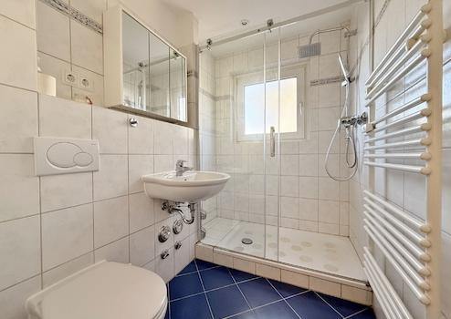 Das Tageslicht-Duschbad ist hell gefliest und verfügt über eine große, flache Duschwanne mit Glasabtrennung, ein Waschbecken sowie ein WC. Ein Handtuchheizkörper ergänzt die Ausstattung und sorgt für zusätzlichen Komfort.