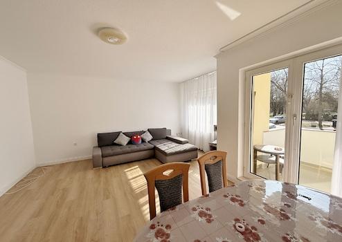 Herzstück ist das Wohn- und Esszimmer, das durch seine angenehme Größe verschiedene Möblierungsvarianten ermöglicht. Hier lassen sich Wohnbereich und Essplatz gut kombinieren. Von diesem Raum aus erreichen Sie auch die Süd-Loggia. Sie bietet Platz für einen kleinen Tisch und Sitzgelegenheiten und erweitert den Wohnraum in der warmen Jahreszeit um eine Außenfläche.