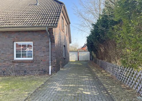 Über die Auffahrt gelangt man zur Nordseite des Hauses. Hier befindet sich der Eingang für die rechte Wohnung. Die Eingänge zur mittleren und linken Wohnung befinden sich hinter dem Haus. Alle Wohnungen sind recht ...