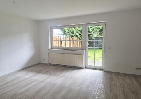 Über das Wohnzimmer gelangt man in den pflegeleicht gestalteten und abgeschlossenen Gartenbereich.