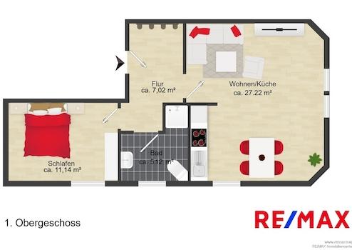Die 2-R-Wohnung im 1. Obergeschoss ist wie folgt aufgeteilt: