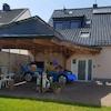 Regenwasser von der östlichen Dachseite und dem Carport und der Garage mit Holzschuppen wird mit Genehmigung in den Garten geleitet und versickert dort. Erhebliche Einsparung von Abwassergebühren.