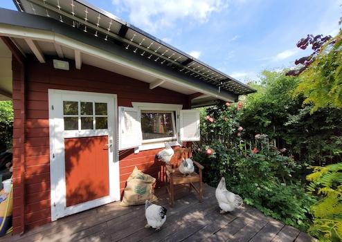 Gartenhütte: isoliert mit Klimasplit Gerät (kann heizen und kühlen). Dach mit Sandwichplatten zur Isolierung. An der Rückwand Hühnerstall angebaut.