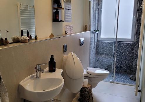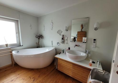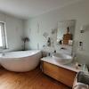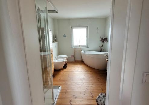- Bad Obergeschoß: Villeroy & Boch Serie Aveo, freistehende Badewanne, Waschbecken, Toilette, Bidet, große Dusche, Duschabtrennung von Koralle.