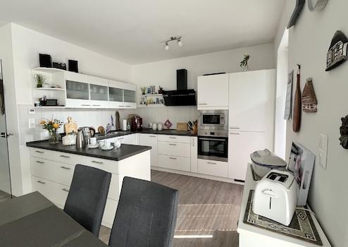 Das Herzstück der Wohnung bildet der großzügige Wohn- und Essbereich mit offener Küche. Bodentiefe Fenster sorgen hier für eine angenehme Lichtdurchflutung und bieten direkten Zugang zur attraktiven Terrasse. Diese lädt dazu ein, entspannte Stunden im Freien zu verbringen. Von der Terrasse aus gelangen Sie durch eine abschließbare Durchgangstür nach außen.