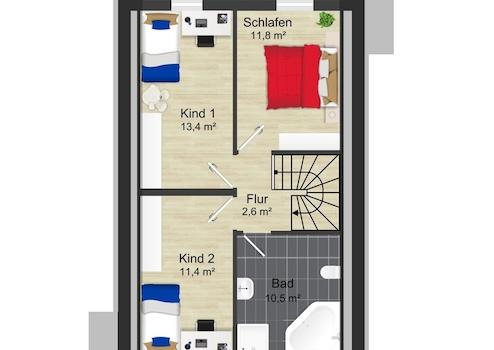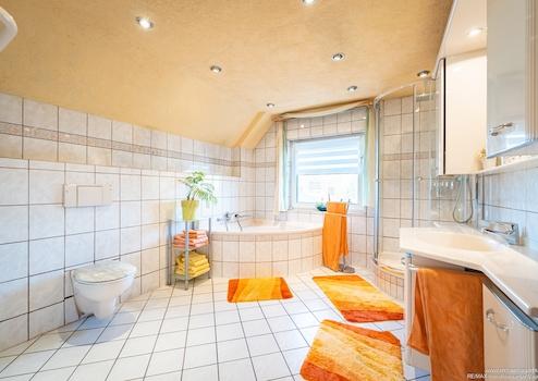 Im Dachgeschoss befinden sich das Elternschlafzimmer sowie zwei weitere Zimmer, die sich flexibel als Kinder-, Arbeits- oder Gästezimmer einrichten lassen. Das freundliche Tageslichtbad mit seiner komfortablen Eckbadewanne bietet Ihnen einen ruhigen Ort zum Entspannen.