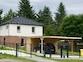 Die große Natursteinterrasse schließt an Küche und Wohnzimmer an. Im Vordergarten befindet sich ein Carport für zwei Fahrzeuge mit integrierten Gartenschuppen. Das Zufahrtstor ist elektrisch betrieben und kann per Funk bedient werden.