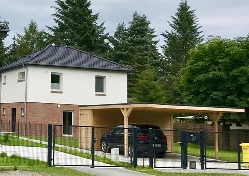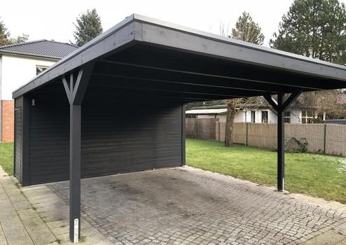 -Holzcarport (mit integriertem Gartenschuppen) für zwei Stellplätze auf dem Grundstück