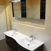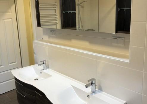 -zwei Bäder mit bodengleichen Duschen mit Glasabtrennungen und großen Badheizköpern(Handtuchtrockner), eines zusätzlich mit Badewanne und Doppelwaschtisch mit Unterbau und Spiegelschrank