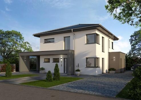 Das moderne Stadthaus von STREIF wird von einem Übereck-Erker und einem überdachten Hauseingang mit angeschlossenem Carport akzentuiert. Auf einer Raumgrundfläche von 158 m² sind 4 Schlafräume, 2 Bäder, ein