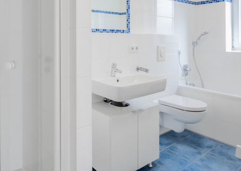 Das Tageslichtbad ist mit Badewanne, Dusche und Handtuchheizkörper ausgestattet. Zusätzlich steht ein separates Gäste-WC zur Verfügung.