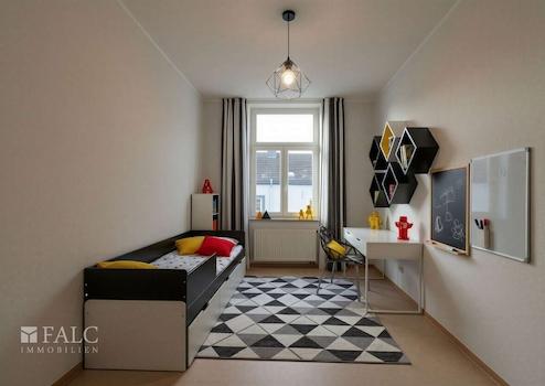 Über den zentralen Flur erreichen Sie alle Räume der Wohnung. Gleich zu Beginn befindet sich ein flexibel nutzbares Zimmer, das sich ideal als Kinderzimmer, Homeoffice oder Gästezimmer eignet. Am Ende des Flures liegt das großzügige Hauptschlafzimmer, das dank seiner optimalen Raumaufteilung viel Platz für ein komfortables Mobiliar bietet. Große Fenster sorgen in beiden Zimmern für viel Tageslicht und ein freundliches Ambiente.